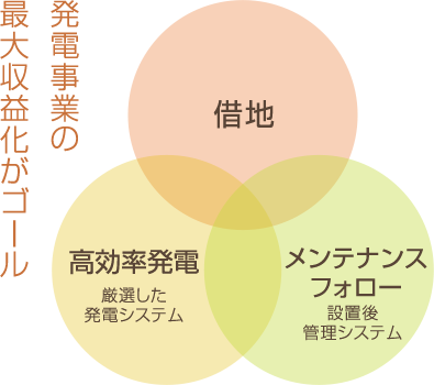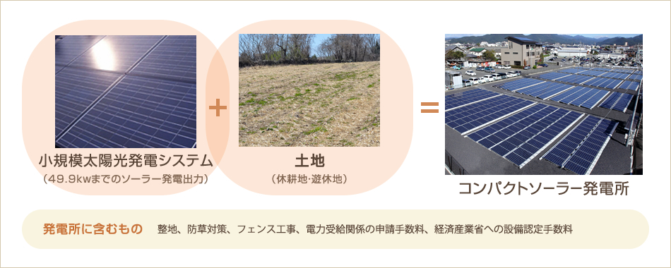 コンパクトソーラー発電所は、サラリーマンにもできる収益ビジネスです。「借地」と「太陽光小型発電システム」がセットなので、土地がない方でも始めやすいパッケージ。