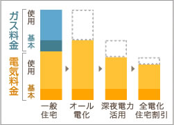光熱費を削減家庭のエネルギーを電気のみにすることで、ガスなどの基本料金分を節約できます。エコキュートを利用し、深夜電力を安くする電気料金プランを利用すれば、一般的に光熱費の3割を占めるといわれる給湯費の大幅削減が狙えます。